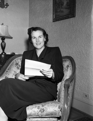 Image shows a bust shot of Mrs. Ariela Goldthwaite. She is shown seated in a chair. Ariela Goldthwaite is the chairman of the United States Golf Association's women's committee, she succeeds Miss Frances Stebbins. Ariela Goldthwaite had been a member of the association for four years. She will be in charge of the women's national golf tournament at the Town and Country Club in St. Paul. Last year she was the president of the Texas Women's Golf Association. Published in the Fort Worth Star-Telegram morning edition, February 11, 1951.