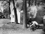 Image shows Explorer Scouts troop 51 Clarence Starns in uniform, left, and Ronald Jones, right, attending to Bobby Mathis, center, laid down, in a simulated atomic bomb attack at 1400 block of Boulevard. Unidentified group of people are looking on the far left. The house is shown to be on fire. Published in the Fort Worth Star-Telegram morning edition, February 11, 1951.