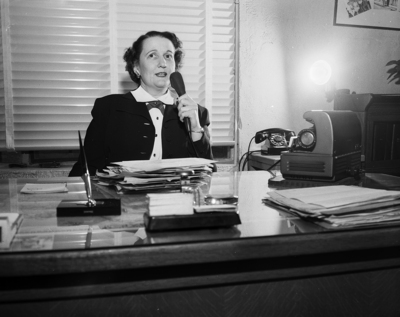 Miss Vila Hill, of 6405 Kenwick, head of an export department for Panther Oil and Grease Company. She is pictured behind a desk, holding a microphone. She was included in an article about five working women who stated that they "learned by doing". Published in the morning edition, February 25, 1951.