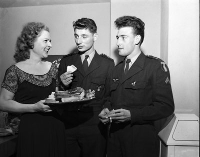 Mrs. Gwen Palmer, left, of 1025 Lipscomb is shown serving French fliers, Corporal Jean Dubey, center, from Nice, and Corporal Jacques Achard, from Paris, at lunch given to the, by the Gamma Chi chapter of Epsilon Sigma Alpha, at the Armed Forces Center. Mrs. Palmer was the state president of the sorority. The fliers were stationed at Sheppard Field. Published in the morning edition, February 11, 1951.