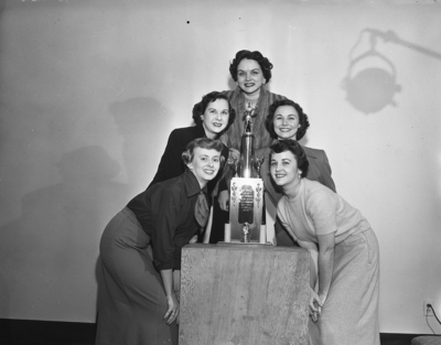 Here's the state team trophy, decoratively surrounded clockwise from lower left by Norma Sweet, Marjorie Mann, Cheryl Clark, Betty Bass, and Cloyce Chafin.