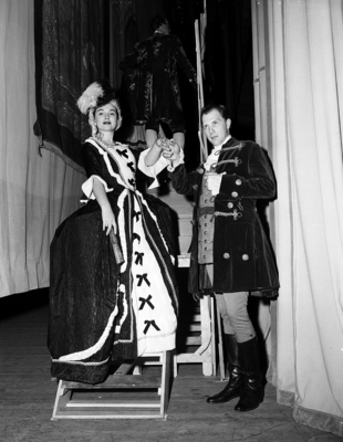 Image shows left, Jean Gibbons as Countess Almaviva and William Shriner as the count are back stage during the comedy, "The Marriage of Figaro". Jean Gibbons is shown to be standing on stairs holding William Shriner's hand. Unidentified actor is shown behind Gibbons and Shriner. Published in the Fort Worth Star-Telegram evening edition, February 13, 1951.