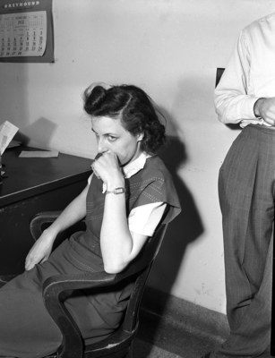 Image shows Mrs. Sarah E. Taylor seated beside desk. An unidentified person is shown to the right of Sarah E. Taylor. She is accused of drowning her child. Published in the Fort Worth Star-Telegram morning edition, February 13, 1951.