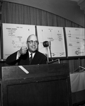 In Fort Worth to conduct a gathering for the Sales Executives Club, Chicago sales expert B. Franklin Bills is shown after commenting on the Korean War. Bills is quoted as saying he believes that the war "could mean an economic bust for the United States." Published in the morning edition, February 13, 1951.