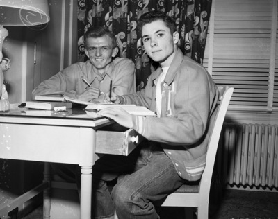 Milam Rowold, left, and Jack sharp, Sam Houston State students representing the Bryan Golden Gloves team. Rowold is lightweight, Sharp flyweight. Published in the Fort Worth Star-Telegram evening edition, February 14, 1951.