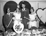 Image shows Mr. and Mrs. Jerry Lee Howard, center, at a Valentine Wedding. Beside them are, left, Charles Wilcox and right, Luanne Wade, sweetheart king and queen of Birchmann Avenue Baptist Church at the annual sweetheart banquet. They are shown to be standing behind a banquet table decorated with Valentine's day decorations. Published in the Fort Worth Star-Telegram morning edition, February 14, 1951.