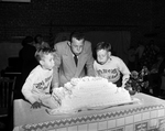 Image shows from left to right, Howard Faulkner, Bill Burklow, and Dale Russell. They are shown blowing out candles on the Fort Worth Boys Club's 16th birthday cake. Burklow, the club's first member in 1935 helped the boys celebrate the founding celebration. Behind them is a group of unidentified people. Published in the Fort Worth Star-Telegram morning edition, February 14, 1951.