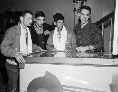 Marble board game gets eyes of four Bryan Regional Golden Gloves champions at Fort Worth for state tournament. Left to right are Welter Jimmy Deliganes, Middleweight Roy Harris, Bantam Cecil Reis and Light-Heavyweight John Lewis. Published in the Fort Worth Star-Telegram morning edition, February 15, 1951.