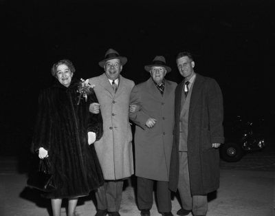 Mr. and Mrs. J. T. Gibbons, left, came down from Washington to hear their daughter, Jean Gibbons, sing in "The Marriage of Figaro," presented by the Civic Opera Association. To their right stands E. H. Johansen, also of Washington, and I. E. Crawford. Published in the morning edition, February 15, 1951.