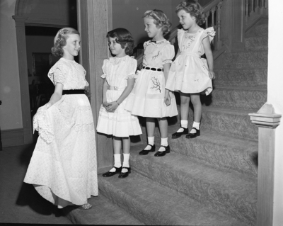 These pretty members of the younger set modeled dresses designed for them by Ruby Hayes at the luncheon at the Woman's Club. At the bottom of the stairs is Patricia Mahan, 11, and bottom, left to right, are Cathy Prichard, 6, Jan Luther, 6, and Anita Reid, 5. Published in Fort Worth Star-Telegram morning edition, March 4, 1950.