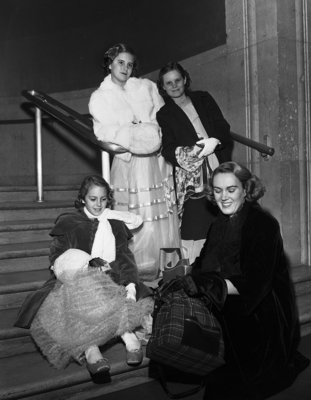 Dresses for a night at the opera, Mrs. William Fuller, lower right, waits with her daughters, Marcia seated lower left, and Adelaide, upper left. Standing to the right of Adelaide is their guest, Janet Bowlen. The ladies were attending the opening night of the Civic Opera Association's performance of "The Marriage of Figaro." Published in the evening edition, February 16, 1951.