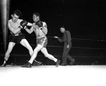 Image shows Brownwood's Winston Lackey, right, punching the body of Thomas Roper, Waco lightweight. Lackey won by decision. Unidentified referee on right. Published in the Fort Worth Star-Telegram evening edition, February 16, 1951.