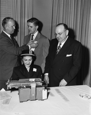 Frigidair dealers and salesmen drove through the ice and snow to see the 1951 Frigidair refrigerators and ranges at Hotel Texas. At left, F. R. Roark of the Good Housekeeping Shop, at 2824 West 7th, is shown pinning a registration ribbon on W. L. Leatherbury, a sales representative from Dayton Ohio. Mrs. Ruth Dodd, secretary at Frigidair Sales Corporation, registers in J. S. Reynolds of Moonahans. Published in the evening edition, February 15, 1951.