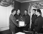 Brigadier General C. S. Irvine, second from the left, is shown beaming in approval as Covair Manager A. C. Esenwein, far left, hands a commendation plaque to Colonel Richard T. Black, commander of the 7th Bomb Group at Carswell Air Base. Similar plaques were presented to Colonel Calvin W. Fite, Jr., second from the right, formerly the commander of the 436th Bomb Squardron, and Colonel William R. Calhoun Jr., far right, deputy commander of the 11th Bomb group. The plaques were given as recognition of record-making B-36 performance during the previous month. Published in the morning edition, February 16, 1951.