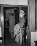 Jay Harris, right, brother of slain gambler Nelson Harris, is shown as he prepared to tell the Tarrant County Grand Jury about alleged gambling payoffs. Grand Jury Bailiff Jack Ferris, left, can be seen with his back to the camera. Published in the morning edition, February 16, 1951.