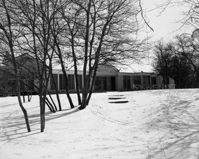 Image shows the snow covered front lawn of the newly purchased home of Mr. and Mrs. Byron Scarborough at 3733 Cresthaven. Published in the morning edition, February 18, 1951.