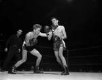 Image shows Joe Boland, left, San Antonio, holding Dick Cole, Dallas, in preparation for a right punch to the chin during bantam match. Boland, won the fight with a knockdown. Unidentified referee on left. Published in the Fort Worth Star-Telegram morning edition, February 17, 1951.