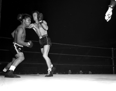 Image shows a boxing match at Golden Gloves tournament. Beaumont's Andy Domebo, left, ducks inside right punch thrown by Middleweight Wayne Marker, Odessa. Both boxers are shown to have their eyes closed. Domebo won the decision. Published in the Fort Worth Star-Telegram evening edition, February 17, 1951.