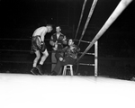 Image shows boxer Charles Ward, left, receiving instructions, between rounds, from Sergeant Eddie Clayton, right, seated. Center is Dick Ward. Ward beat Rudy Valadez of Odessa. Published in the Fort Worth Star-Telegram morning edition, February 18, 1951.