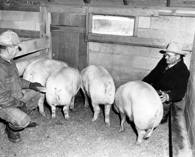 Image shows Jacob Acker, left and Castro County Agent Raymond Kind, right, look over Chester White hogs. The hogs were prepared by Acker's sons, Tom and Jack, 4-H feeders. Acker breeds Chesters. Published in the Fort Worth Star-Telegram March 1951.