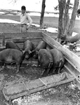 Image shows Floyd Schulte with some Duroc pigs being fed by his brother, Gilbert, on Castro County farm. Published in the Fort Worth Star-Telegram March 1951.