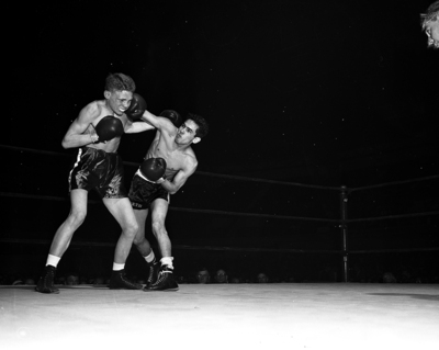 Image shows a boxing match at Golden Gloves tournament. Raymond Riojas, right, lands a right punch on Herbert Mason, Wichita Falls. Published in the Fort Worth Star-Telegram morning edition, February 19, 1951.