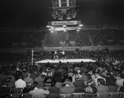 The picture shows a crowd watching the state golden gloves in the Will Rogers Coliseum. In the boxing ring are two boxers in the middle of a match.