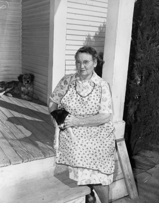 Expanding oil development in the city of Cisco. Image shows Mrs. A. V. Clark, whose land plays host to seven oil producers. Mrs. Clark can be sitting outside on the porch of a house with a dog in her lap. Next to her, to the right of the image, another dog can be seen laying down. Published in the morning edition, February 18, 1951.