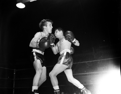 Image shows a boxing match at Golden Gloves tournament. Freddie Morales, right, Abilene, shows a uppercut to chin of Fort Worth's Horace Hooper. Morales gained decision in bantamweight match. Published in the Fort Worth Star-Telegram morning edition, February 20, 1951.