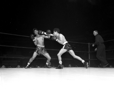 Image shows a boxing match at Golden Gloves tournament. Raymond Riojas, right, Fort Worth, punches Joe Vasquez in the jaw in the Golden Gloves featherweight semifinals match. Riojas scored a technical knockout. Published in the Fort Worth Star-Telegram morning edition, February 20, 1951.
