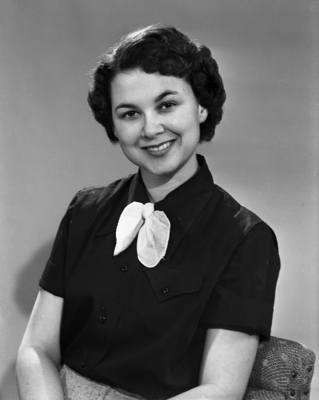 Image shows Miss Carcelle Wilbanks. Miss Wilbanks is shown smiling, posing for the camera, wearing a dark blouse with a light colored bow tied at the collar. Published in the morning edition, February 20, 1951.