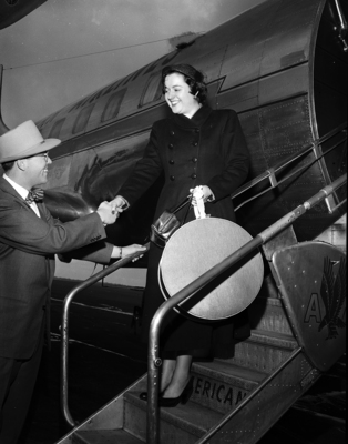 Image shows Miss Patricia Anderson, one of the 35 Swift and Company home economists who share the name Martha Logan, as she exists a plane and is welcomed to Fort Worth by Paul Leonard, of Leonard's Department store. Published in the morning edition, February 20, 1951.