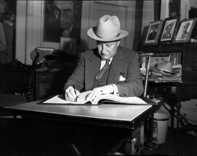 Winthrop W. Aldrich, chairman of the board of Chase National Bank of New York City, shown signing guest register at the Fort Worth Club.
