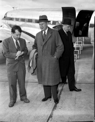 Winthrop Aldrich shown with Amon Carter, Sid Richardson, and other members of the board of the Chase National Bank. They recently have just gotten of their plane.