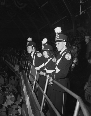 Hanging over the arena rail were, left to right, Bill Tom Hutchinson, Ann Hunter and Don Waters of the Coleman school band.