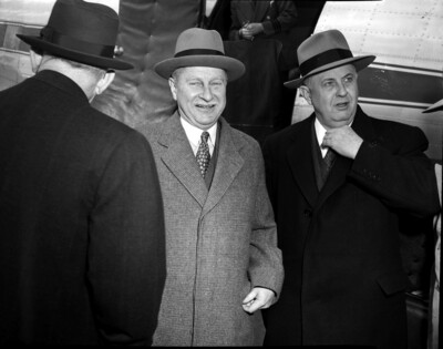Winthrop Aldrich (center) shown with members of the board of the Chase National Bank at the airport with a plane seen in the background.