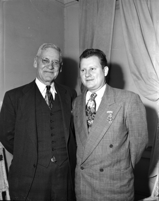 L. A. Freeman of Smithfield, left was the oldest (1905) past chancellor of Queen City Lodge, Knights of Pythias. He is shown standing next to J. L. Pevehouse, of 2406 Noble, the newest (1951) chancellor. published in the evening edition, February 21, 1951.