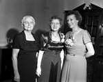 Image shows a tea held for the Texas Christian University Women's Club, at Foster Hall. Standing left to right, are Mrs. J. E. Mothershead, club president; Mrs. M. E. Sadler, an honored guest; and Mrs. Cortell Holsapple, chairman. Published in the morning edition, February 21, 1951.