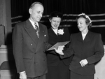 R. O. Fincher, left, principal of E. M. Daggett Elementary and Junior High Schools, was presented a state life membership in the Texas Congress of Parents and Teacher by Mrs. Harris Forsyth, right, a past president of the Daggett Parent Teacher Association. Also present was Mrs. Joe M. Teichman, center, current president of the Daggett Parent Teacher Association. Published in the evening edition, February 23, 1951.