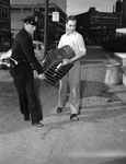 Patrolman Marvin Wills, and Joe Shirley, a volunteer, are shown maneuvering a heavy slot machine toward the entrance of the city jail, where the machine would be placed into storage. Published in the morning edition, February 22, 1951.