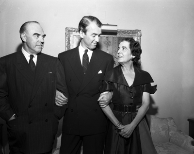 Mr. and Mrs. Francis Kirk Johnson, shown with actor, Jimmy Stewart. In 1942, Johnson started the Live Oak Stable, that he owned with Stewart. Published in the evening edition February 23, 1951.