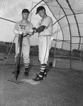Image of two TCU players at home plate, as they tried a new gadget, a batting tee. Catcher Bill Looney, left, prepares to take a cut at the ball under direction of Coach Walter Roach. Published in Fort Worth Star-Telegram morning edition February 23, 1951.