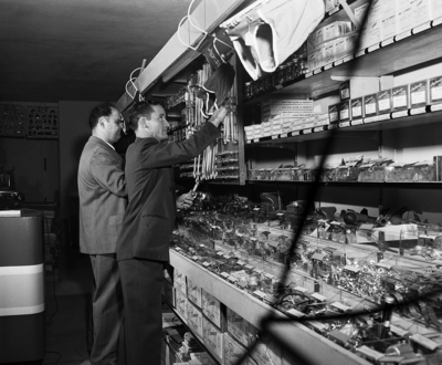Shown putting the finishing touches on merchandise displays at the new Kragen;s Auto Supply are, left, Bob Kragen, owner, and right, Bill Walden, manager. Published in the morning edition, February 23, 1951.
