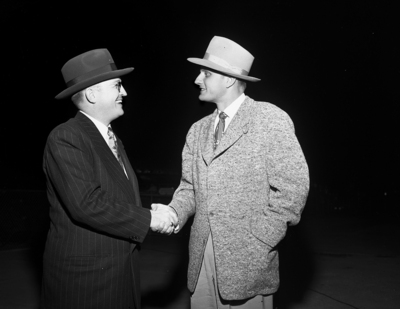 Reverend James N. Morgan, left, co-chairman of the Billy Graham Greater Fort Worth Evangelistic Crusade, is shown greeting Evangelist Billy Graham upon the others arrival at Meacham Field. Published in the morning edition, February 23, 1951.