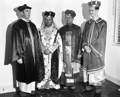 Four of the 28 members of the 64th Masonic District degree team, are shown in full ceremonial robes at a Masonic observance of Washington's birthday on the night of February 23rd. Left to right, are, L. G. Waldrip, chaplain, at Tarrant Lodge; Lee E. Galloway, King Solomon at Arlington Heights Lodge; T. J. Holloway, a senior warden; and M. H. Barry Sr., a senior deacon at Tabernacle Lodge. Published in the morning edition, February 23, 1951.
