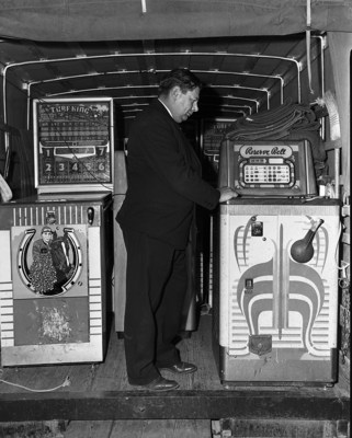 Assistant District Attorney Truman Power, is shown inspecting a console model slot machine that was confiscated during a raid earlier in the week. The machines were loaded onto a van to be hauled away. Published in the evening edition, February 22, 1951.