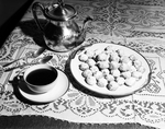 Image shows a coffee pot and a plate of cookies on table. Published in the Fort Worth Star-Telegram March 1951.