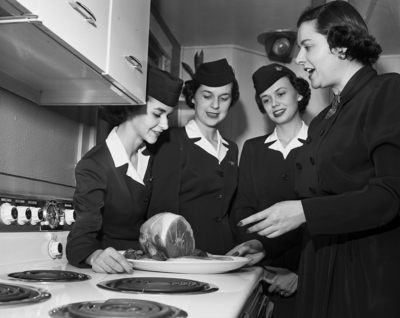 American Airline hostess are shown as they get a preview from Martha Logan, right, of the techniques that she would introduce at the first session of the Leonard's Department Store's 10-day cooking school. The hostesses are, left to right, Misses Sally Hudson, Betty Burnett, and Jean Hill. Published in the morning edition, February 24, 1951.