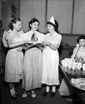 Image shows three teens dressed as story book characters at the Riverside Junior High School tea. Left to right, are Key Clendenning, dressed as Alice from Alice in Wonderland; Anna Miller dressed as Becky Thatcher from Tom Sawyer; and Mary Ann Christian, dressed as Sue Barton from Sue Barton: Student Nurse. Published in the morning edition, February 26, 1951.