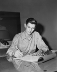 Image shows Milton Molhusen, from Austin, show writing on paper. Representatives from 13 Southwestern cities at Tavener's Playdium to start second weekend of competition in the 24th annual Southwest Bowling Association tournament. The association covers an eight state area.
